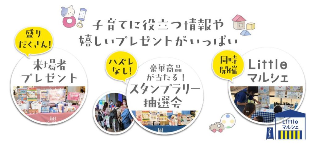 子育て応援イベント / ファミリーイベント / 参加無料 / 来場プレゼント / スタンプラリー抽選会 / おひるねアート / おすわりアート / 手形足形アート / キッズスペース / 歯固め / ハイハイレース / やさいジュレ / マミーゼリー / ハイハイン / おみせやさんごっこ / でんしゃごっこ / バスごっこ / ポケットメルちゃん / スイスイおえかき / おむつが臭わない袋 / まいにちおいしい袋 / スコッチ・ブライト ハイブリッド貼り合わせスポンジ / ミノン / マー&ミー / 液体塩こうじ / 減塩追いこうじ味噌 / e-WASHマルチクリーナー / ミルキーローション / おしめかえ隊 / DonebyDeer / Lets Shake! PANCAKE / mamacharmキッズミルクローション / AESTURA アトバリア365クリーム / アトバリア365エマルジョン / お買物券・お食事券 / 商品券 / ギフトカード